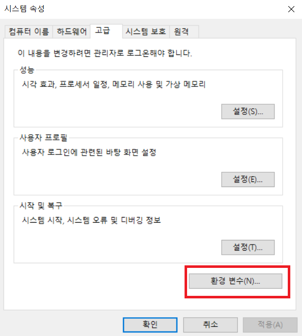 고급 탭으로 이동 시 환경 변수라는 항목이 보일 것이다.
