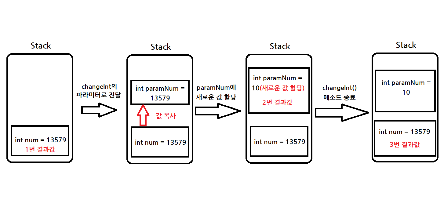changeInt() 메소드에서 변경한 변수의 값은 파라미터로 num을 복사하여 만든 paramNum의 값을 변경한 것이다.