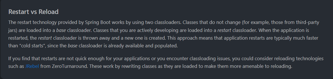 이렇게 하면 base 클래스로더에서 관리하는 변경사항이 발생하지 않는 클래스들은 다시 로딩하지 않으므로 restart 시간이 줄어든다.