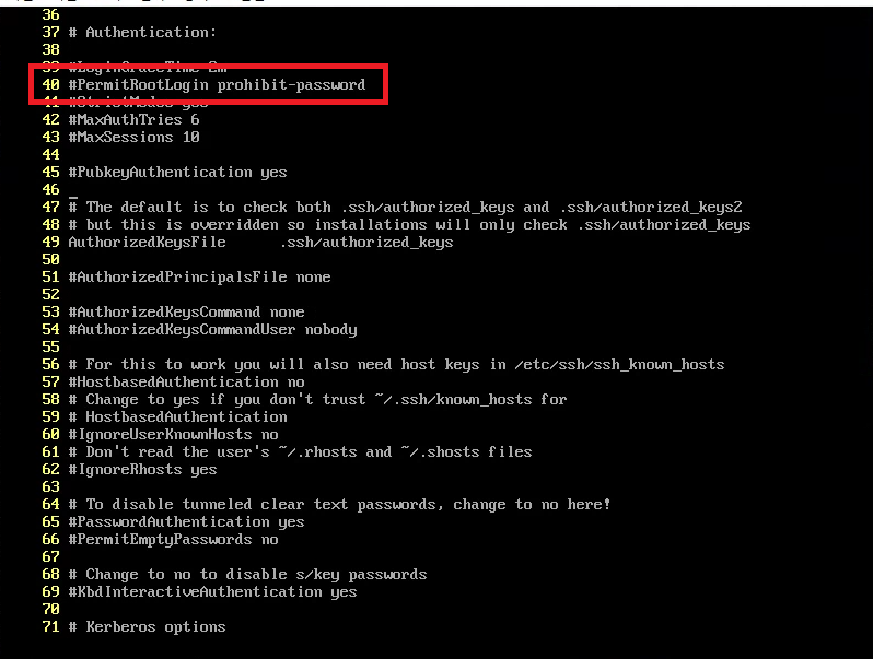 허용 - /etc/ssh/sshd_config의 40번째 라인에 있는 PermitRootLogin을 주석 해제 후 yes로 변경해준다.