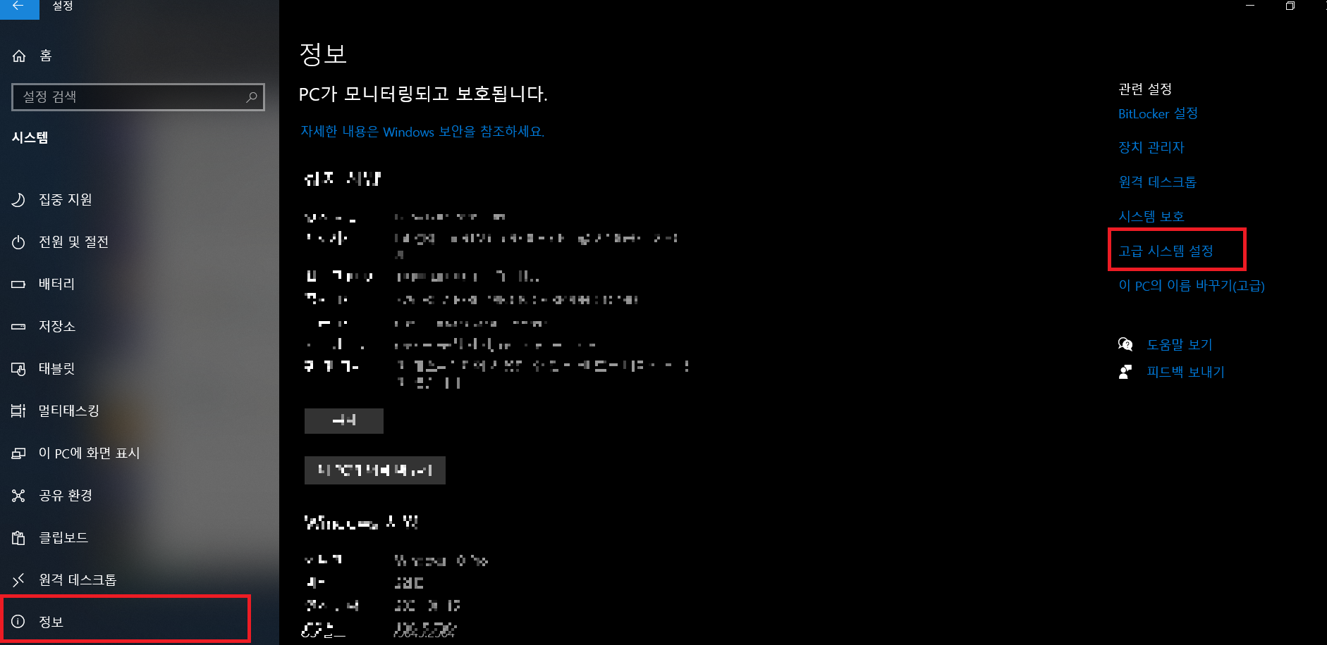 시스템 속성 창은 시작 > 설정 > 시스템 > 정보 > 고급 시스템 설정 또는