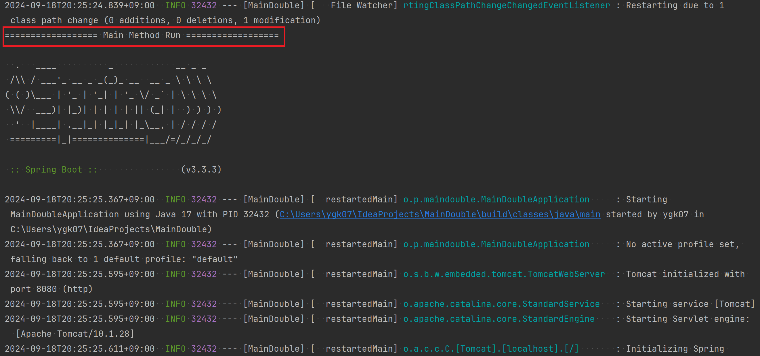 Main Method Run이 출력되는 걸 보면 새 restart 클래스로더를 생성하기 위해 main 메소드가 다시 실행되었다는 것을 알 수 있었고